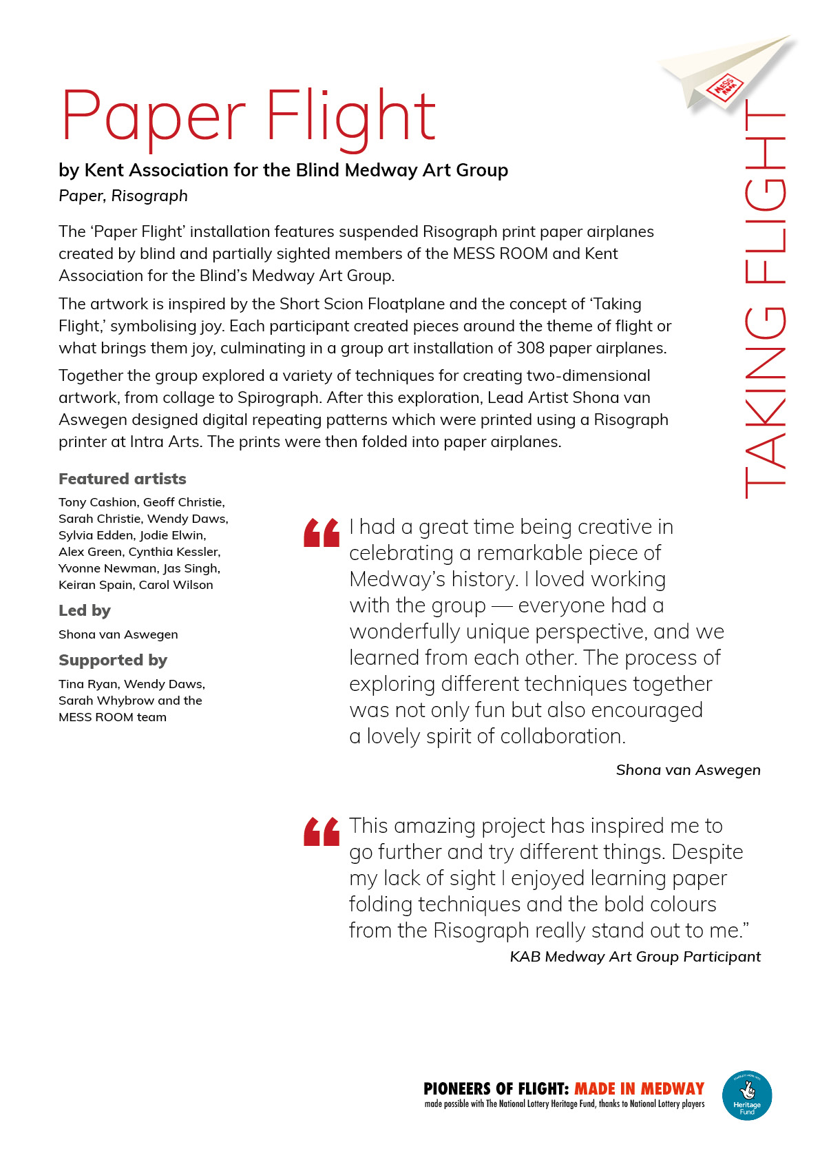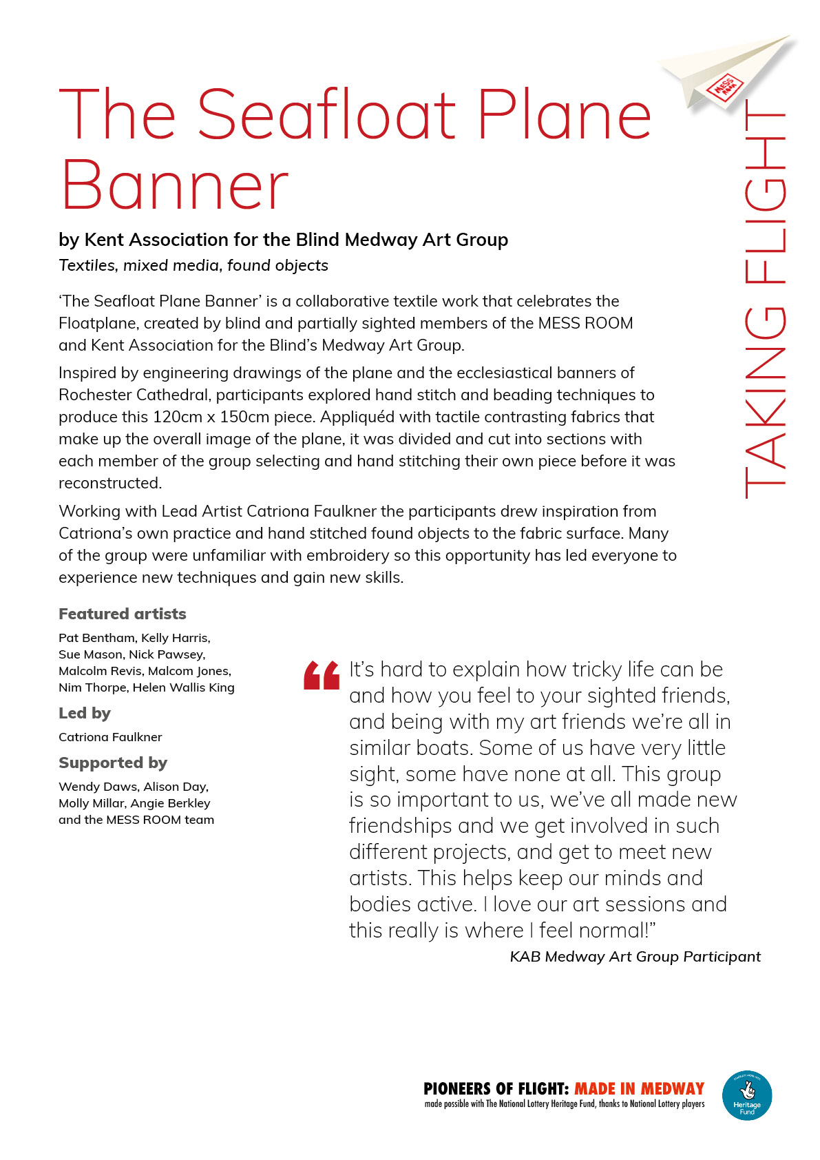 Featuring work by over 60 participants, artists and volunteers, Taking Flight celebrated the creativity of individuals living with full or partial sight loss. Our brief was to create interpretive materials that remained clear and engaging within the low light of the Cathedral’s Crypt. We developed exhibition panels designed for optimum readability in subdued lighting.